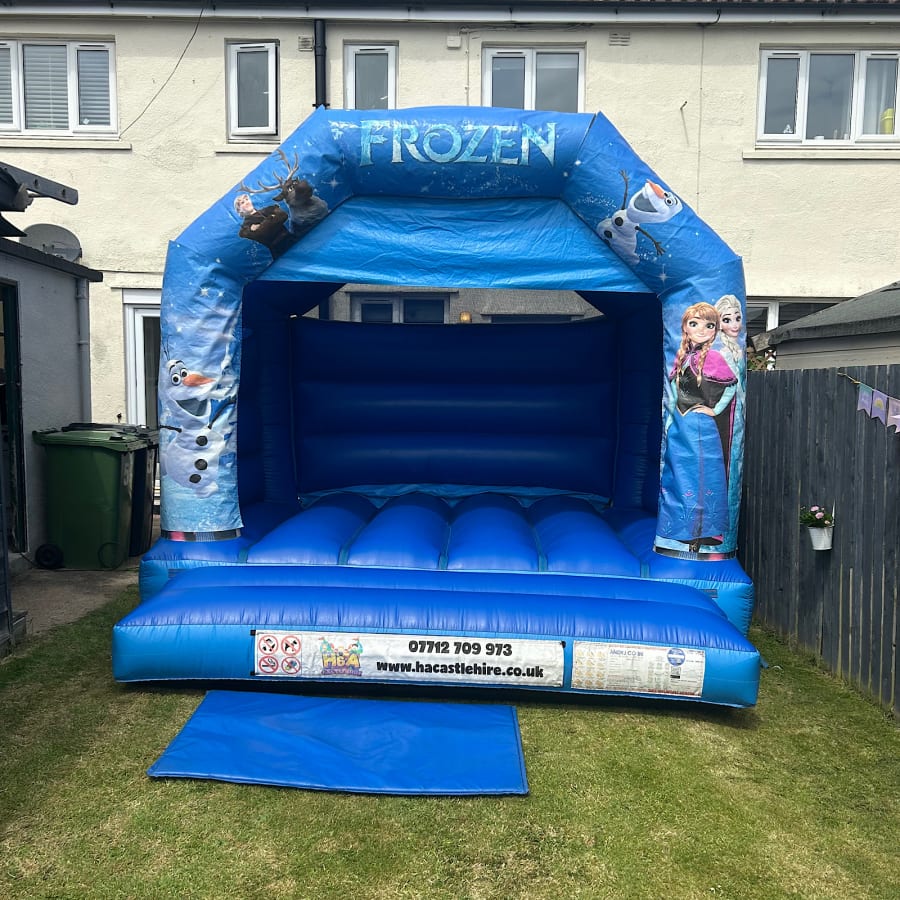 When booking our Frozen bouncy castle please double check that you have the space required, Our frozen castle can only be set up on real grass outdoors, And with a minimal sloped area, and is well away from any fixed objects. (Rain cover is fitted this Bouncy castle )
