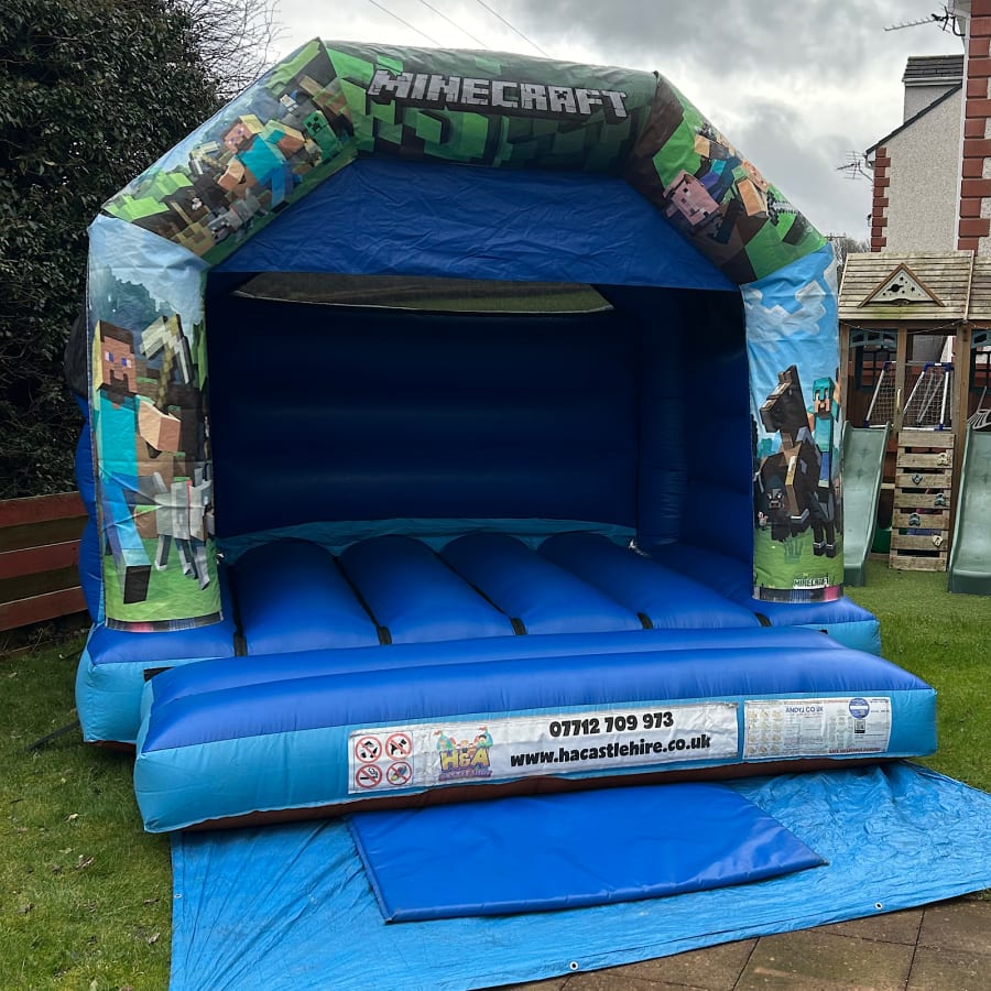 When booking our Minecraft bouncy castle please double check that you have the space required, Our Minecraft castle can only be set up on real grass outdoors, And with a minimal sloped area, and is well away from any fixed objects. (Rain cover is fitted this Bouncy castle )